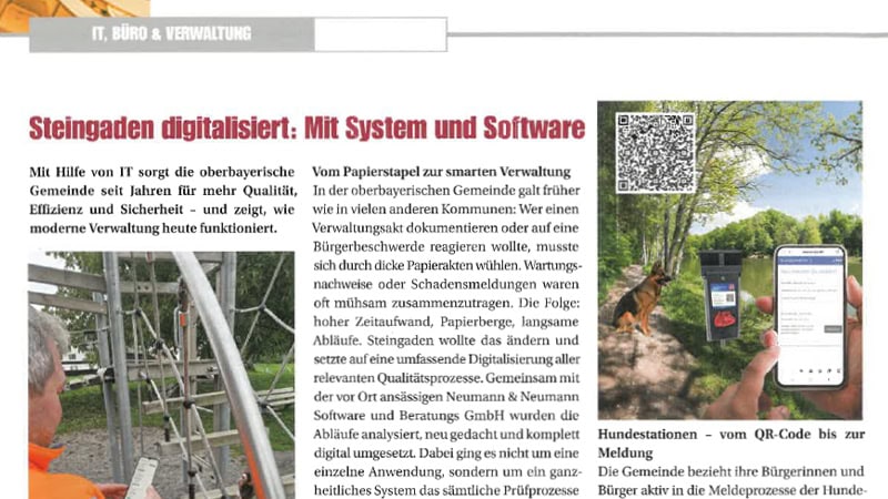 In der oberbayerischen Gemeinde galt früher wie in vielen anderen Kommunen: Wer einen Verwaltungsakt dokumentieren oder auf eine Bürgerbeschwerde reagieren wollte, musste sich durch dicke Papierakten wühlen. Wartungsnachweise oder Schadensmeldungen waren oft mühsam zusammenzutragen. Die Folge: hoher Zeitaufwand, Papierberge, langsame Abläufe. Steingaden wollte das ändern und setzte auf eine umfassende Digitalisierung aller relevanten Qualitätsprozesse. Gemeinsam mit der vor Ort ansässigen Neumann & Neumann Software und Beratungs GmbH wurden die Abläufe analysiert, neu gedacht und komplett digital umgesetzt. Dabei ging es nicht um eine einzelne Anwendung, sondern um ein ganzheitliches System das sämtliche Prüfprozesse und Wartungskontrollen miteinander vernetzt.