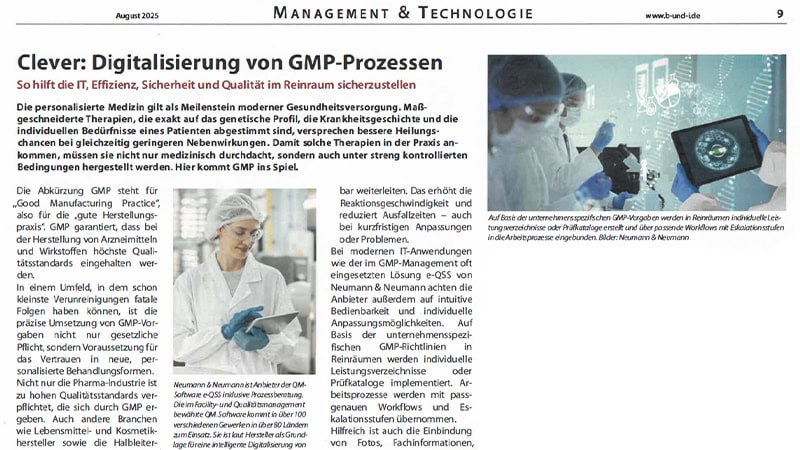 Bei modernen IT-Anwendungen wie der im GMP-Management oft eingesetzten Lösung e-QSS von Neumann & Neumann achten die Anbieter außerdem auf intuitive Bedienbarkeit und individuelle Anpassungsmöglichkeiten. Auf Basis der unternehmensspezifischen GMP-Richtlinien in Reinräumen werden individuelle Leistungsverzeichnisse oder Prüfkataloge implementiert. Arbeitsprozesse werden mit passgenauen Workflows und Eskalationsstufen übernommen. Hilfreich ist auch die Einbindung von Fotos, Fachinformationen, Verfahrensanweisungen oder Kurzfilmen. Beispielsweise für die Reinigung einer bestimmten Maschine im Reinraum. Hier können auch Prüfkataloge hinterlegt werden.